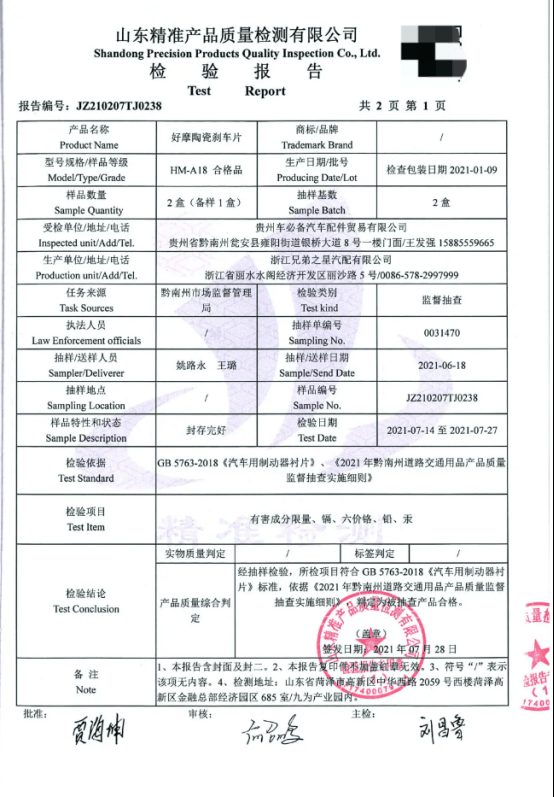 顶刮刮刹车片的价值不仅在于产品本身,更体现在对生命的极致敬畏。2021年黔南州质检报告,是其可靠性的铁证: