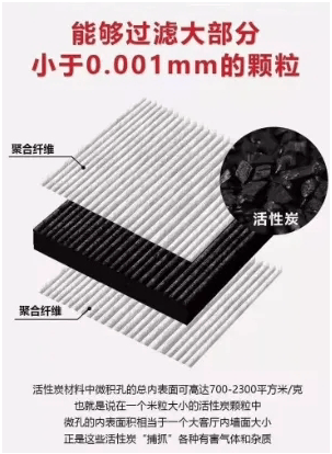 其核心卖点在于多层过滤结构。它采用高品质熔喷布和活性炭层,能有效拦截PM2.5、灰尘、花粉等颗粒物,过滤精度可至0.001毫米级别。活性炭层的微孔内表面积高达700-2300平方米/克,相当于一个米粒大小的颗粒具有大客厅墙面的吸附面积,能强力捕捉甲醛、二手烟、TVOC等有害气体和杂质。